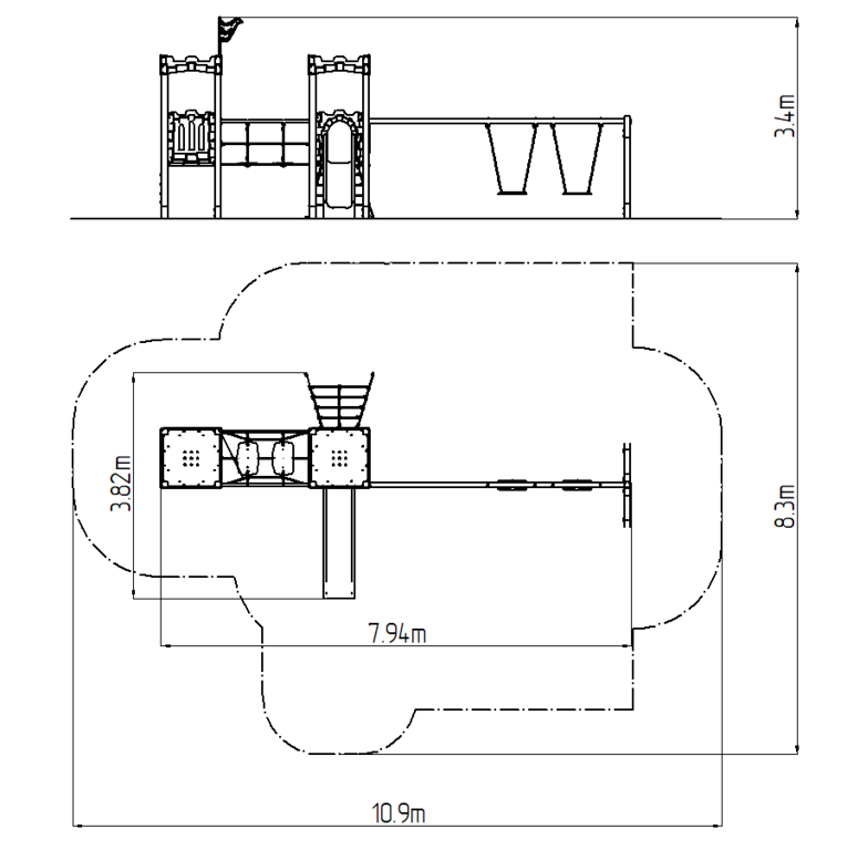 Minimální bezpečný prostor: 10,9 x 8,3 m